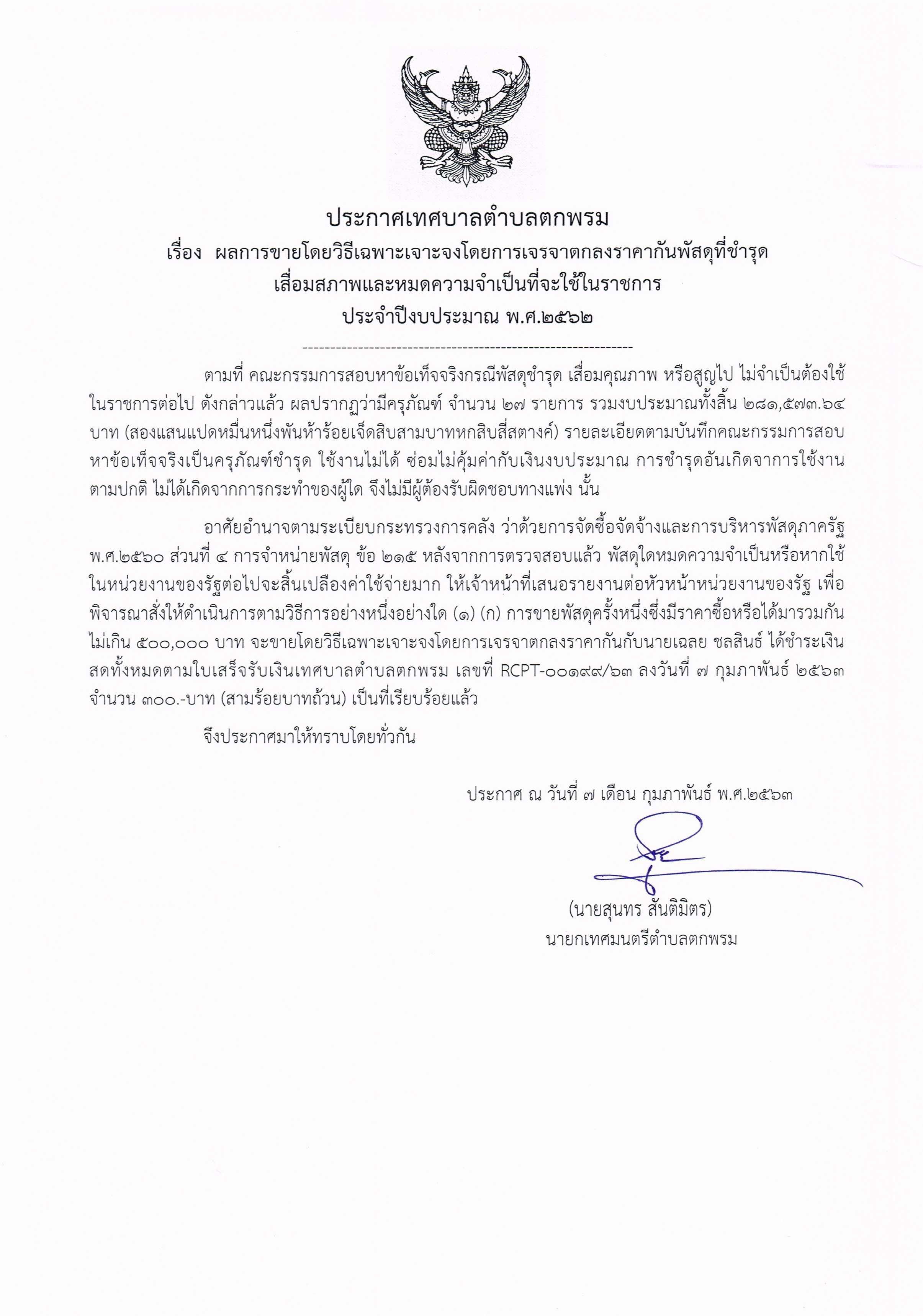 ประกาศเทศบาลตำบลตกพรม เรื่อง ผลการขายโดยวิธีเฉพาะเจาะจงโดยการเจรจาตกลงราคากันพัสดุที่ชำรุดเสื่อมสภาพและหมดความจำเป็นที่จะใช้ในราชการ ประจำปีงบประมาณ พ