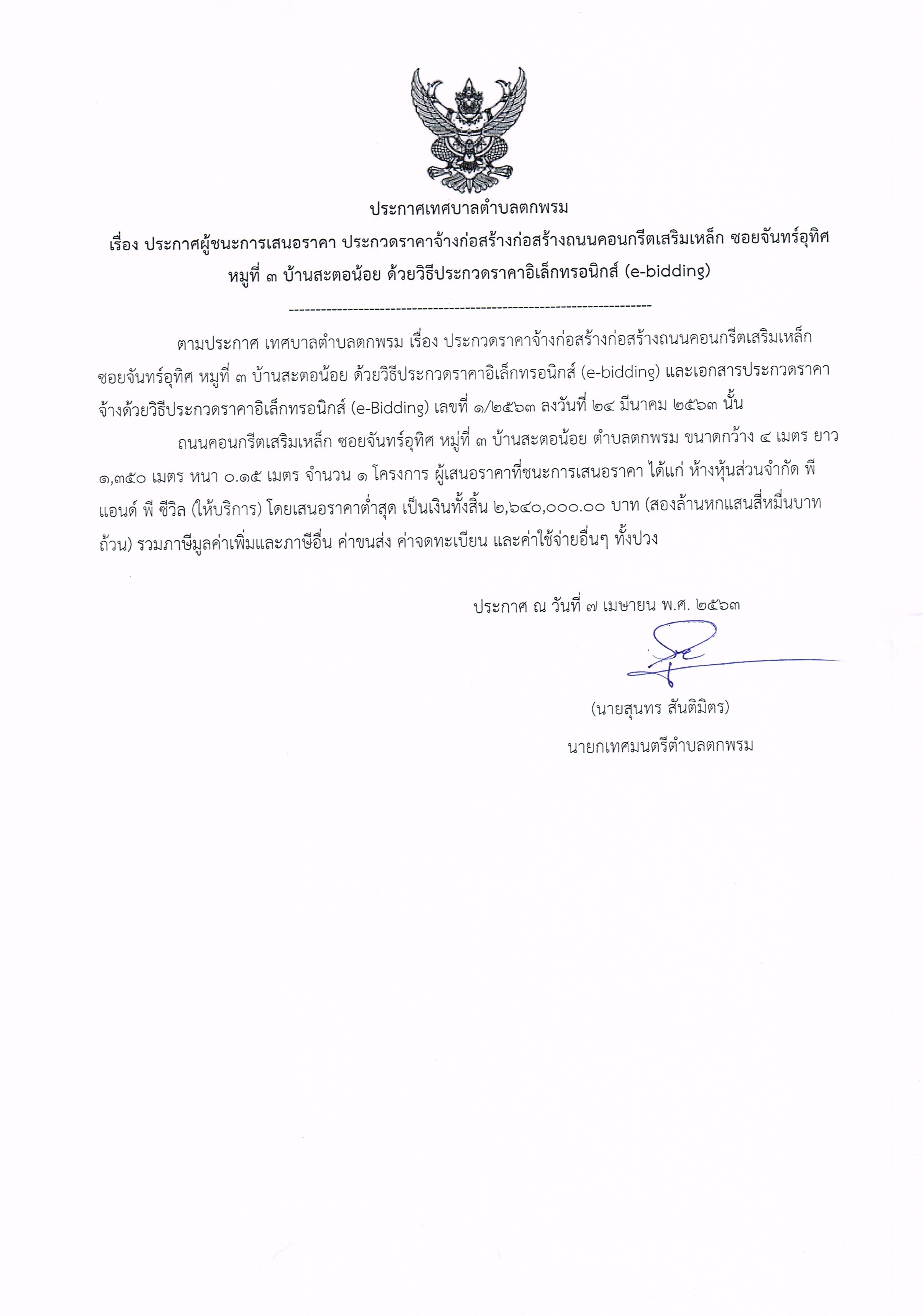 ประกาศผู้ชนะการเสนอราคา ประกวดราคาจ้างก่อสร้างถนนคอนกรีตเสริมเหล็ก ซอยจันทร์อุทิศ หมู่ที่ 3 บ้านสะตอน้อย ด้วยวิธีประกวดราคาอิเล็กทรอนิกส์ (e-bidding)