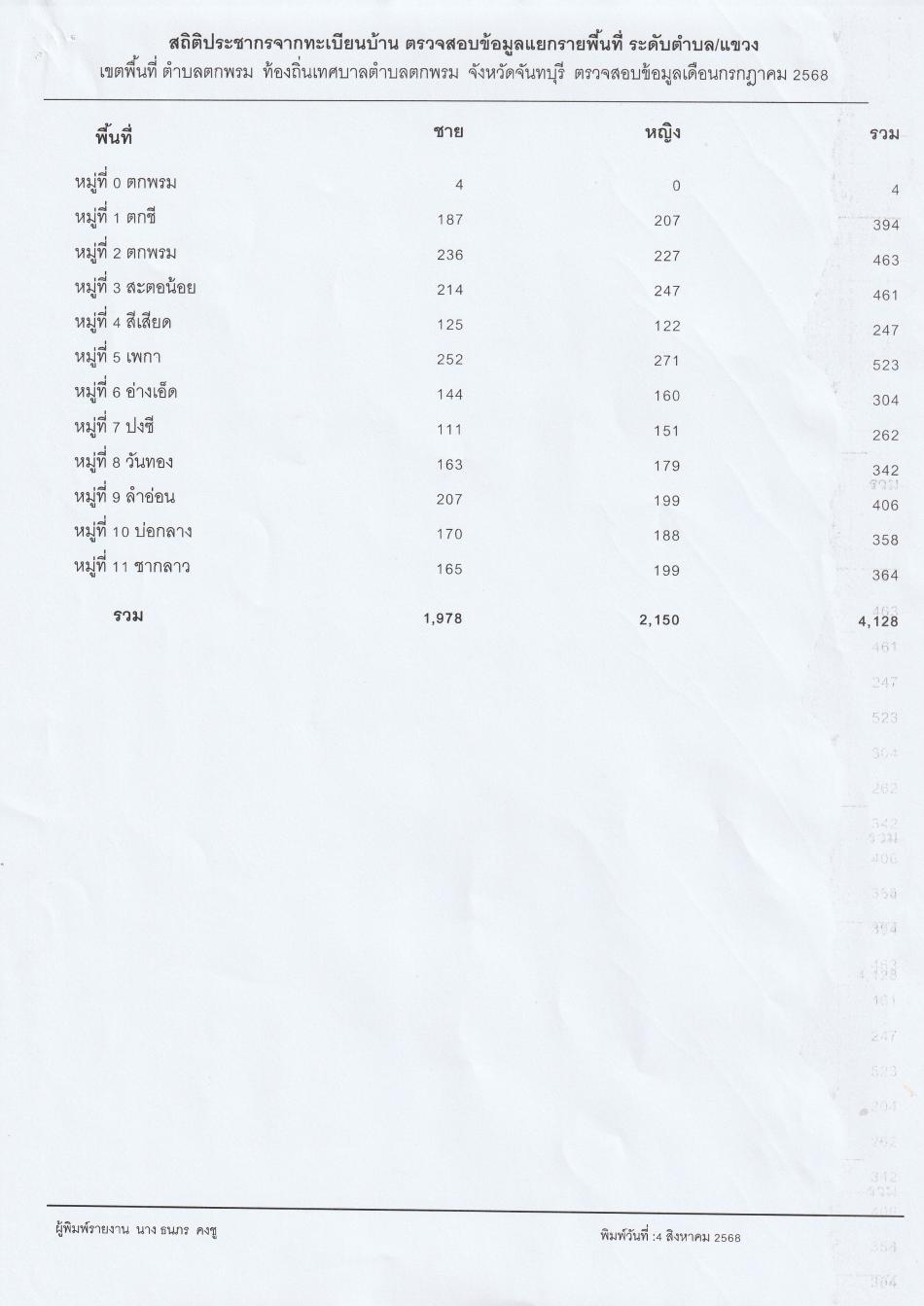 สถิติประชากรจากทะเบียนบ้าน ตรวจสอบข้อมูลแยกรายพื้นที่ ระดับตำบล / แขวง เขตพื้นที่ตำบลตกพรม ตรวจสอบข้อมูลเดือนกรกฎาคม 2568