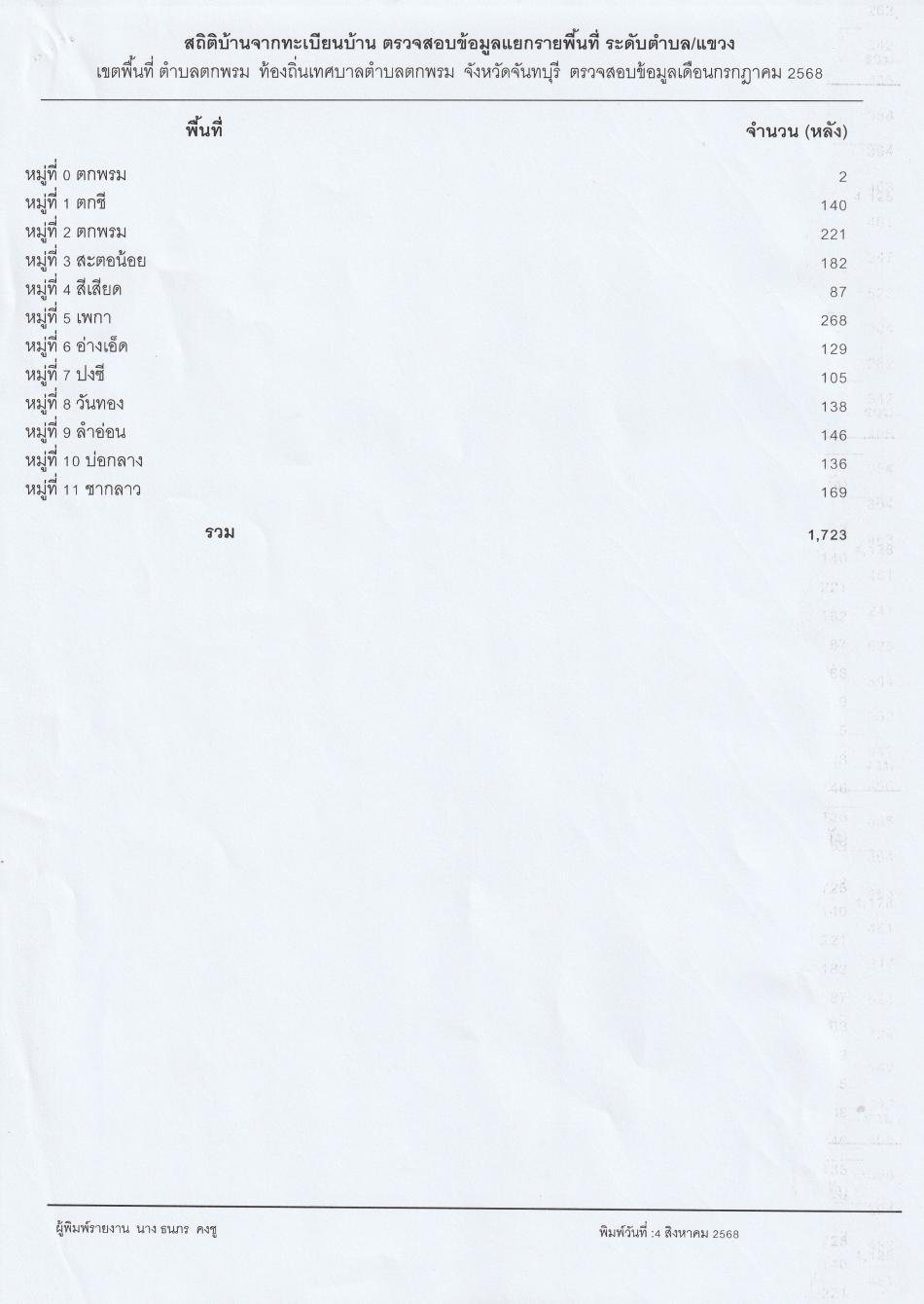 สถิติบ้านจากทะเบียนบ้าน ตรวจสอบข้อมูลแยกรายพื้นที่ ระดับตำบล/แขวง เขตพื้นที่ตำบลตกพรม ตรวจสอบข้อมูลเดือน กรกฎาคม 2568