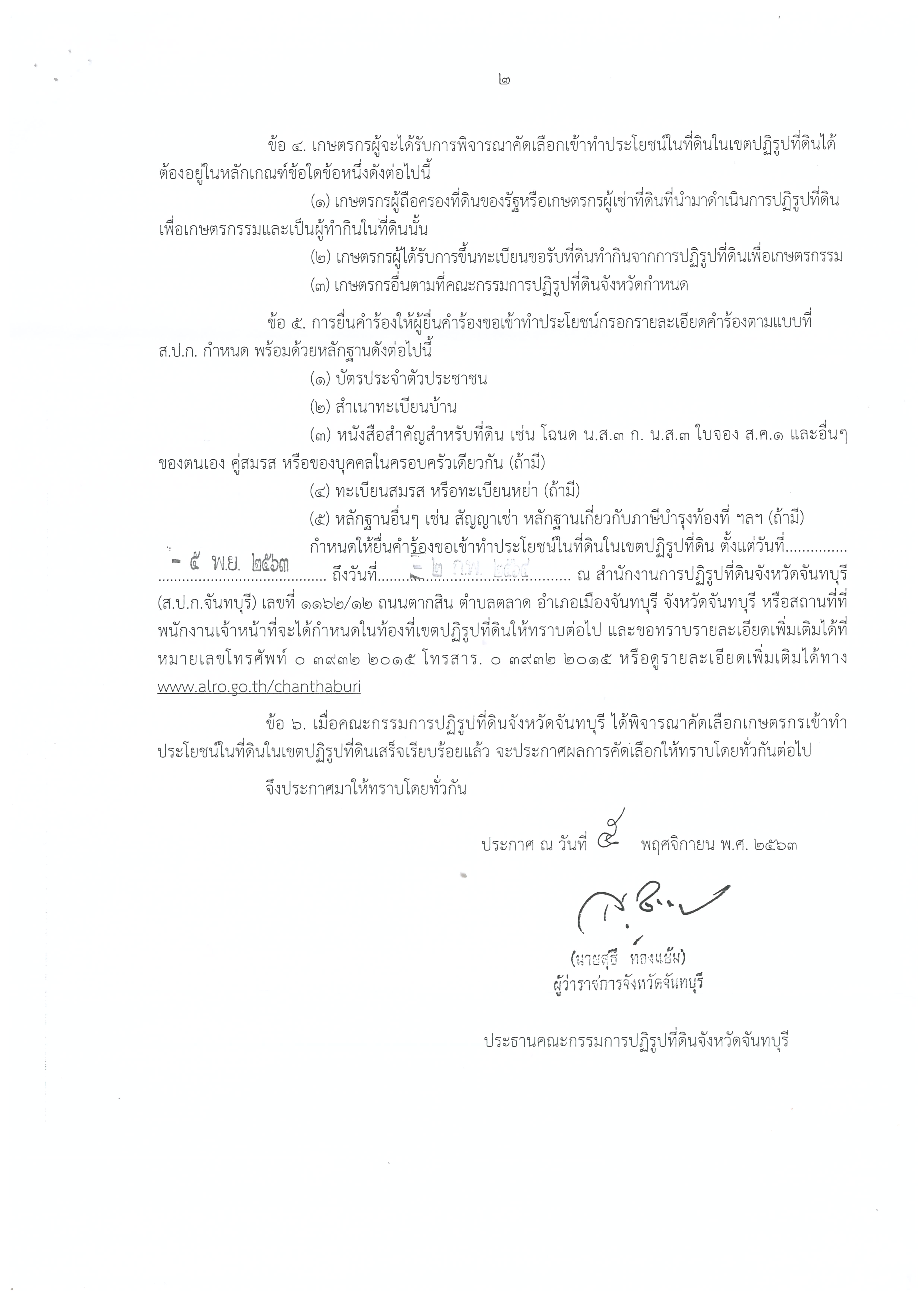 ประกาศคณะกรรมการปฏิรูปที่ดินจังหวัดจันทบุรี เรื่อง ให้เกษตรกรยื่นคำร้องขอเข้าทำประโยชน์ในที่ดินในเขตปฏิรูปที่ดินจังหวัดจันทบุรี (ที่ดินรัฐ)